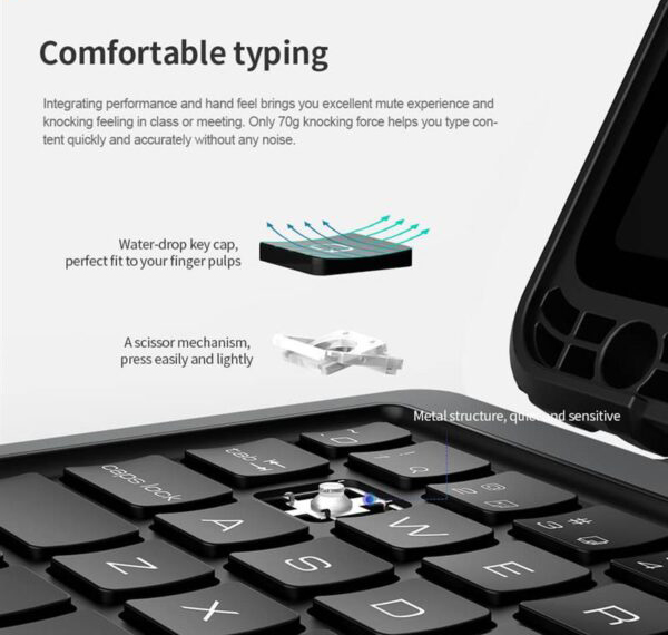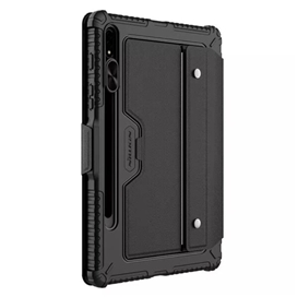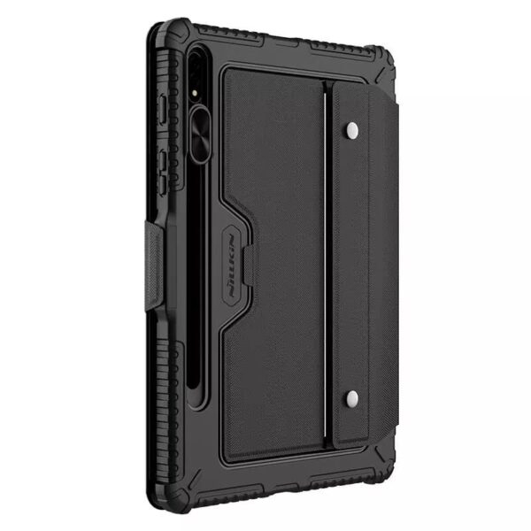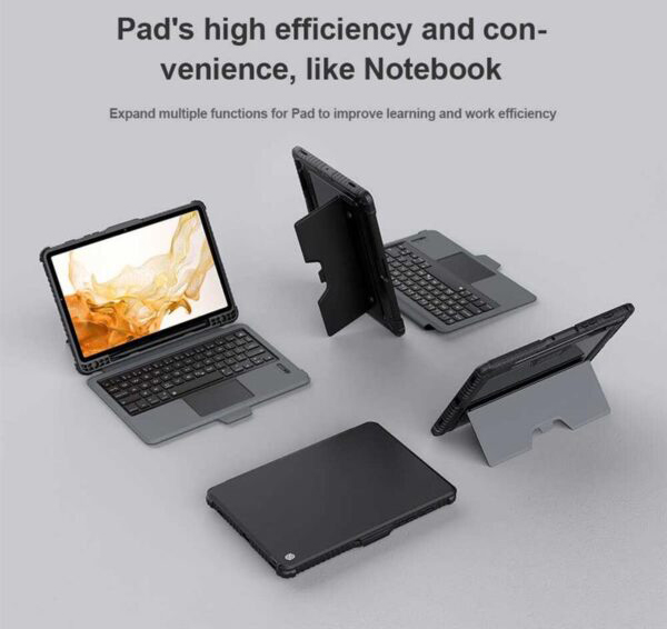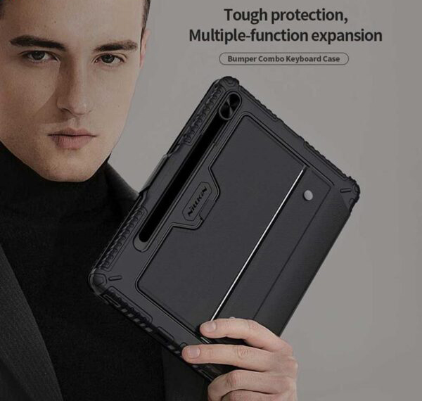 کیف کلاسوری نیلکین مدل New Bumper Combo Keyboard یکی از مهم ترین و کاربردی ترین لوازم جانبی است که شما در کنار Galaxy Tab خود باید تهیه کنید تا تجربه کاربری خود را با دستگاهتان به حداکثر برسانید. ابتدایی ترین کاری که New Bumper Combo Keyboard برای شما انجام خواهد داد محافظت کامل از تمام قسمت ها به خصوص دوربین شماست. پوشش خارجی که ترکیبی با کیفیت از پلی کربنات PC و TPU است و نسبت به نسخه قبلی خود ارتقا یافته است Galaxy Tab شما را در برابر هرگونه ضربات احتمالی و خط و خش ناشی از برخورد با اشیا تیز حفظ میکند. داشتن چنین کیف محافظی در وهله اول با توجه به ارزش بالای دستگاه شما یک امر غیر قابل چشم پوشی است. قابلیت دیگر قابل ملاحظه این است که این قاب برای شما در زاویه 110 تا 180 درجه به صورت استند در میآید تا بتوایند به سادگی هرچه تمام تر به مشاهده فیلم و سریال و یا انجام طراحی و مطالعه کتاب یا مقالات الکترونیکی خود بپردازید بدون آنکه نگران سر خوردن دستگاه باشید. در چهار گوشه این قاب برآمدگی هایی ایجاد شده است تا در صورت سقوط دستگاه ورود ضربه به دستگاه را به حداقل برساند. یکی از مهم ترین ویژگی های این کیف کلاسوری داشتن یک کیبورد بی سیم با بورد 10 متری است که طراحی آن نسبت به نسخه قبلی خود بهینه تر شده است و دکمه های کیبورد طوری طراحی شده اند که بسیار نرم و بدون ایجاد لغزندگی در هنگام تایپ هستند و کمترین صدای ممکن را در هنگم تایپ ایجاد میکنند. دکمه های میانبر آن نیز نسبت به مدل قبلی بهینه تر شده و دارای تغییراتی شده اند. یک باتری 150 میلی آمپر ساعتی لیتیومی در آن بکار رفته است که تنها با 1.5 ساعت شارژ طی تست ها با حدود روزی 2 ساعت کارکرد تا 30 روز برای کاربر کارایی خواهد داشت، پس نگران اتمام شارژ آن در هنگام سفر و یا محیط های بیرون نخواهید بود. تاچ پد روی کیبورد نیز با قابلیت های مختلفی طراحی شده است و همچنین گزینه ای طراحی شده تا بتوانید آنره قفل کنید تا اگر به صورت تصادفی انرا لمس کردید به مشکلی نخورید. نسخه بلوتوث این کیبورد 3.0 است پس حساسیت عملکرد بالایی از آن خواهید دید و به صورت کلی به همراه این کیف کلاسوری فوق العاده خود میتوایند به مانند یک نوت بوک کامل استفاده نمایید. در قسمت جلویی قاب نیز محلی برای قرار دادن قلم هوشمند اپل و شارژ آن به صورت وایرلس طراحی شده است.