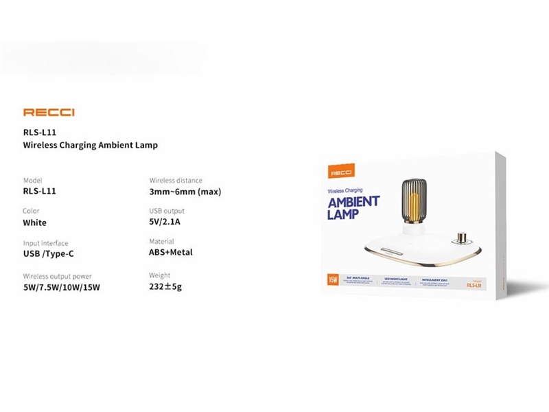 شارژر وایرلس Recci RLS-L11 طراحی فوق‌العاده جذاب و زیبایی دارد و جلوه بسیار زیبایی را میز و اطرافتان می‌بخشد. رنگ سفید آن با رنگ طلایی تلفیق شده و به یک استند فوق‌العاده خاص برای روی میز تبدیل شده است. بدنه‌ای از ترکیب مواد ABS و فلز دارد و در برابر آسیب و ضربه مقاوم است. وزن آن هم 232 گرم است.