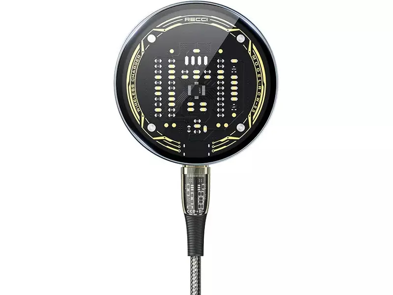 شارژر بی سیم RCW-23CC به شکل صفحهای دایرهای طراحی شده و ابعادی برابر با 7.5*60.5*60.5 میلیمتر دارد. طراحی صفحه شفاف از جنس شیشه حرارت داده شده نمایی جذاب به آن بخشیده وصفحه القال الکتریکی داخلی آن کاملا مشخص است.