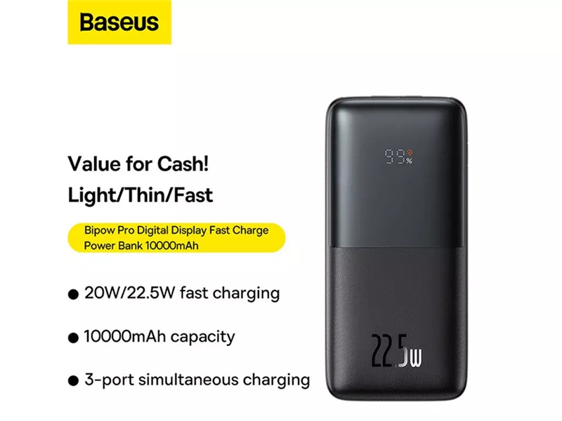 پاوربانک ها به وسیله ای تبدیل شده اند که همیشه و همه جا به همراه کاربر می باشد و این امر باعث شده تا پاوربانک هایی با ظاهر بسیار زیبا به بازار عرضه بشوند.پاوربانک Baseus Bipow Pro PPBD040001 با ظرفیت اسمی 10000 میلی آمپر ساعت، 3خروجی و حداکثر توان خروجی 22.5 وات انتخاب مناسبی برای مصرف روزمره شماست.