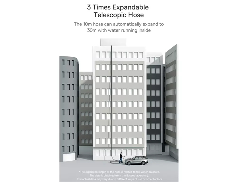 طول شلنگ داخل پک نازل کارواش Baseus GF4 Watering Spray Nozzle CPYY010201 در حالت عادی برابر 10 متر بوده و وقتی جریان آب وارد شلنگ می شود طول شلنگ تا 3 برابر افزایش یافته و طول آن برابر 30 متر می‌شود.