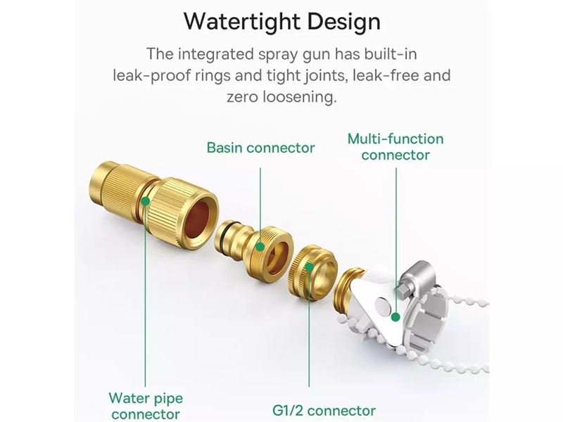 تفنگ آب پاش این محصول، فلزی است ولی به سادگی زنگ نمی زند. سری تفنگ آب پاش، حالت های مختلف پاشیدن آب ( مانند دوش حمام) دارد که می تواند به 5 حالت مختلف آب را خارج کند.