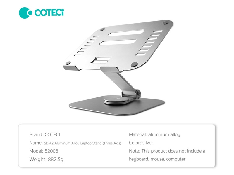 جنس استند Coteetci 52006 از آلیاژ آلومینیوم ساخته شده که مقاومت خوبی در برابر ضربه و فشار دارد. وزن استند Coteetci 52006 برابر با 882.5 گرم است.