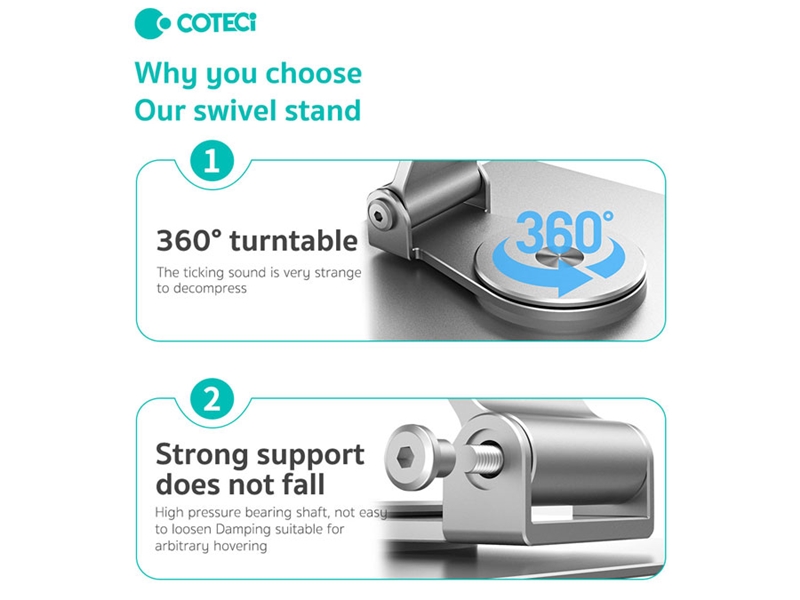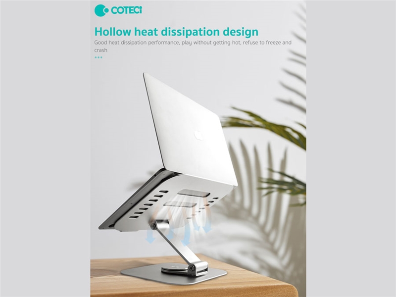 یکی از ویژگی های متمایز استند Coteetci 52006 قابلیت چرخش 360 درجه پایه آن است که موجب شده لپ تاپ خود را در هر زوایه و موقعیتی که دوست دارید تنظیم کنید. از طرفی اتصالات آن محکم است تا حالتی که برایش تنظیم می کنید حفظ کند.