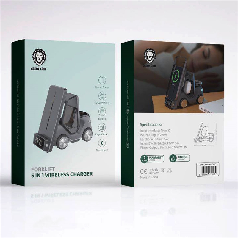 شارژر بی سیم گرین لاین 5 کاره دارای 3 قسمت وایرلس که از آن برای شارژ گوشی موبایل، هندزفری و ساعت هوشمند نیز استفاده کرد.در قسمت جلویی شارژر وایرلس Green Lion Forklift 5 IN 1 ، یک چراغ LED به کار رفته که زیبایی خاصی را به این محصول داده است. قسمت استند یا زاویه 60 درجه طراحی شده است که گوشی در وسط، ساعت در بالا و هندزفری در پشت پایه قرار می گیرد. در قسمت جلویی این شارژر وایرلس یک نمایشگر LED تعبیه شده که امکان نمایش دادن ساعت را خواهد داشت.