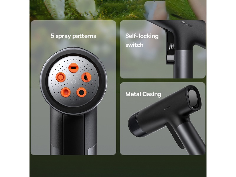 تفنگ آب پاش این محصول، فلزی است ولی به سادگی زنگ نمی زند. سری تفنگ آب پاش، حالت های مختلف پاشیدن آب ( مانند دوش حمام) دارد که می تواند به 5 حالت مختلف آب را خارج کند.