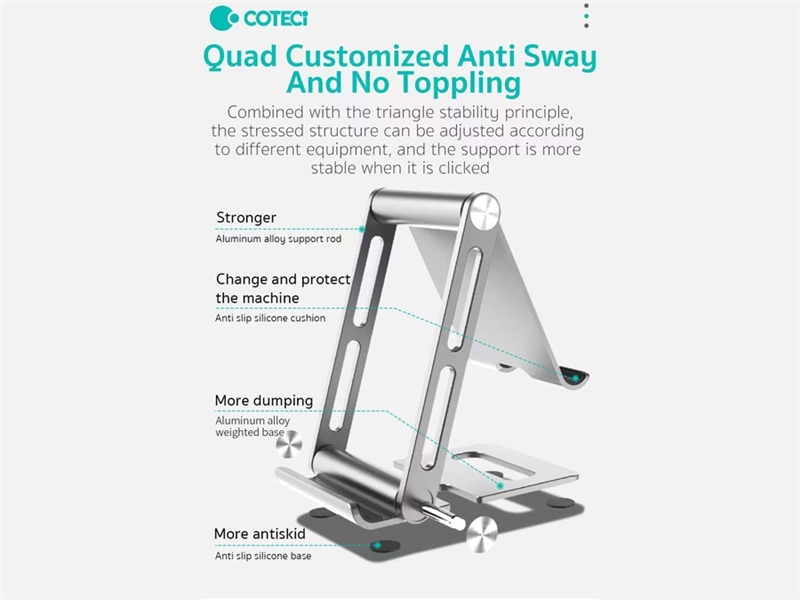 این پایه نگهدارنده موبایل ساختاری از آلیاژ آلومینیوم دارد؛ بنابراین بدنه آن در برابر ضربه، اکسیداسیون فوقالعاده مقاوم است. به صورت تاشو طراحی شده تا حمل راحتی داشته باشد یا درون کشو یا روی میز ای زیادی را اشغال نکند.