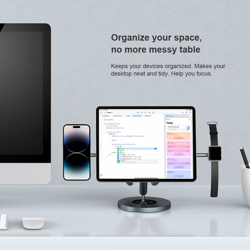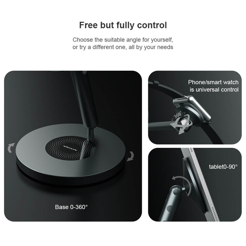 یکی از قابلیت های هولدر رومیزی Nillkin SnapBranch Modular قابلیت تنظیم زاویه دستگاه های متصل شده به هولدر است؛ شما می توانید زاویه بازوی قسمت هولدر تبلت را 0 تا 90 درجه و زاویه هولدر گوشی موبایل و ساعت را تا 360 درجه تنظیم کنید. این قابلیت باعث شده بتوانید زاویه مناسب دید خود را تنظیم کرده و از دستگاه های خود به خوبی استفاده کنید.