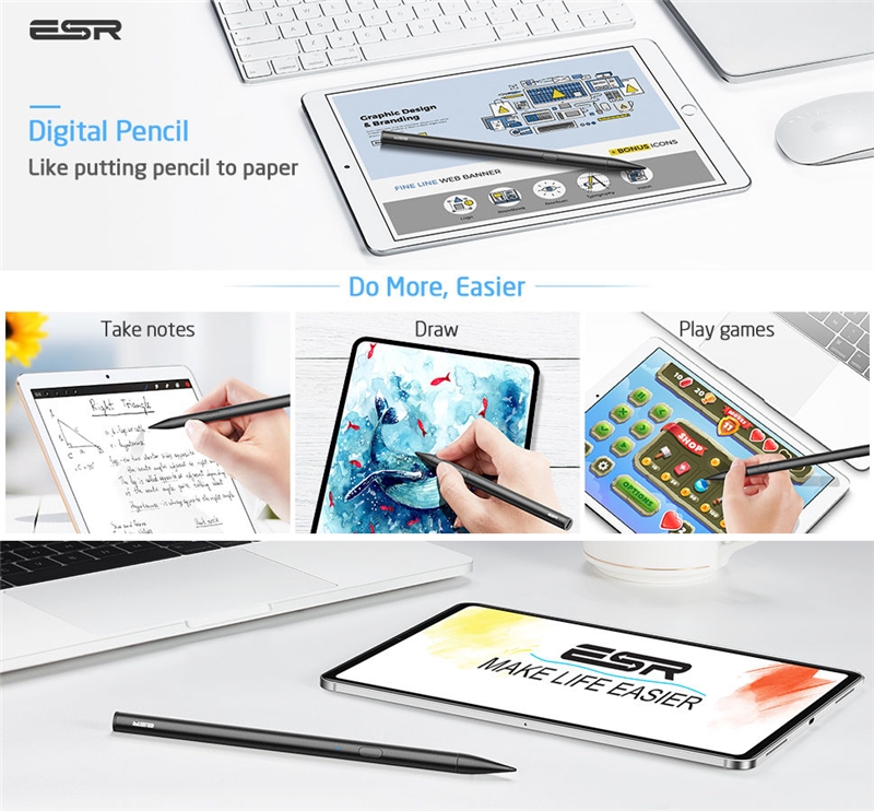 با استفاده از قلم دیجیتال آیپد برند ESR مدل ESR Digital Pencil، تجربه نوشتن و طراحی در دنیای دیجیتال به یک سطح جدید ارتقا پیدا می‌کند. این قلم دیجیتال، همراه وفادار شما در هر نوع خلق و خوی در آیپد خواهد بود، بدون هیچ محدودیتی از نظر مدل‌ها و کاربردها. اکنون با این قلم دیجیتال، آزادانه از خلاقیت خود بر روی صفحه آیپد استفاده کنید