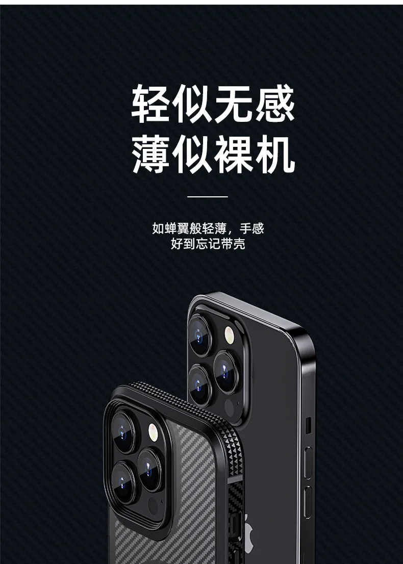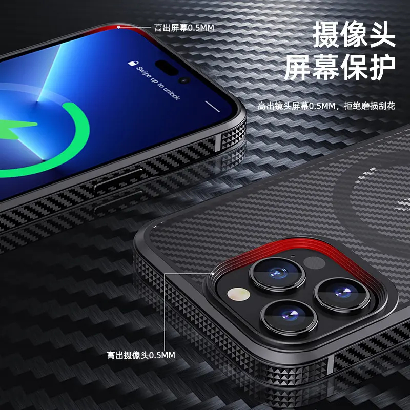 قاب آیفون 14 Pro iPaky MGC از ترکیبی از PC و TPU ساخته شده است و قسمت پشتی آن به صورت نیمه شفاف بوده و دارای بافت فیبر کربنی است. برای محافظت از صفحه نمایش و دوربین لبه های قاب و دور اطراف دوربین به پوششی از جنس TPU مجهز شده اند.