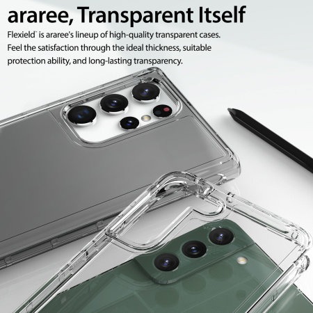 قاب سامسونگ S22 Ultra Araree Flexield ازTPU ساخته شده است که قسمت پشتی آن شفاف است. برای محافظت از صفحه نمایش و دوربین لبه ‌های قاب و دور اطراف دوربین نیز دارای پوششی از جنس TPU مجهز شده اند.