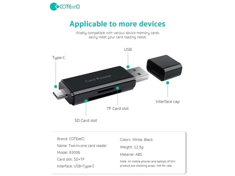 رم ریدر 83006 Coteetci دارای دو کانکتور Type-c و Usb میباشد. به کمک کانکتور تایپ سی این رم ریدر به راحتی میتوانید اطلاعات را از گوشی خود به یک رم و یا از یک رم به یک گوشی منتقل کنید. تنها کافی است که کانکتور Type-c را به گوشی خود وصل کرده و در درگاه کارتخوان نیز رم از نوع SD یا Micro SD قرار دهید. البته برای این کار باید گوشی شما از قابلیت OTG پشتیبانی کند.