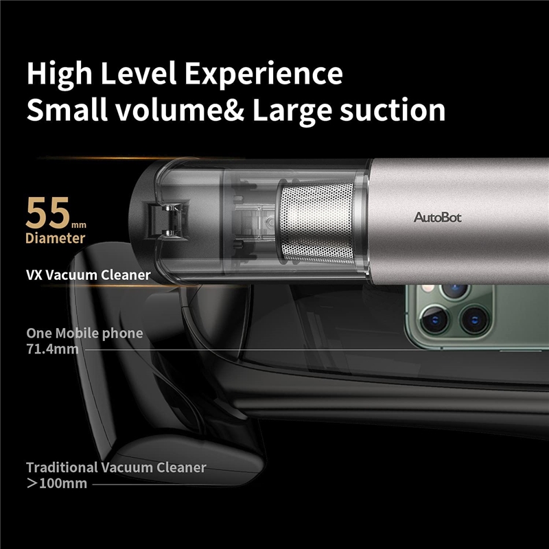 جارو برقی شارژی شیائومی Xiaomi VX AutoBot دارای ابعاد 69.5×57.5×315 میلی متر بوده که به دلیل سایز کوچک و قابل حملی که دارد به راحتی در ماشین و کیف شما جا می‌شود. این جارو وکیوم به صورت استوانه‌ای طراحی شده و در کنار وزن کم 530 گرمی برای گرفتن در دست بسیار ارگونومیک می‌باشد. برای روشن کردن این جارو باید دکمه پاور روی بدنه را فشار دهید و شروع به کار کنید. جنس بدنه این دستگاه از متریال آلومینیوم و PC بوده و چون در معرض ضربه قرار ندارد دوام بالایی خواهد داشت.