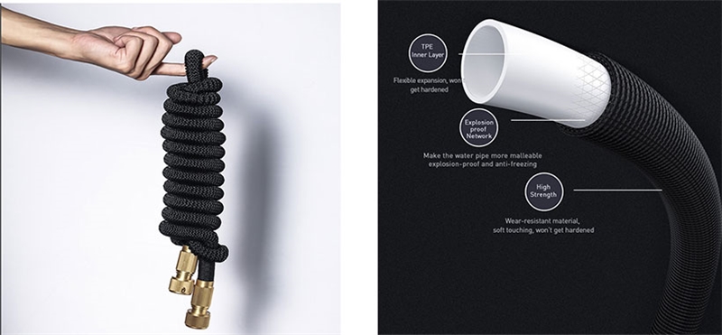 وزن این نازل 217.6 گرم و ابعاد آن 19 در 14 در 35 سانتی متر می باشد. قطعات داخلی نازل، از آلیاژی آلومینیوم ساخته شده اند و قسمت های پلاستیکی آن از نوع پلاستیک ABC / PC هستند. شلنگ 3 لایه دارد، لایه داخلی پلاستیک نوع TPE دارد که انعطاف پذیر بوده و خشک نمی شود. لایه میانی شلنگ الیافی دارد که مانع از ترکیدن آن می شوند و در برابر یخ زدگی مقاوم است. لایه رویی شلنگ نیز ضد ترک خوردن بوده و به آسانی انعطافش را از دست نمی دهد. اتصالات سری های نازل و شلنگ از جنس مس هستند و با شیارهایی که روی شان تعبیه شده، به خوبی محل اتصال شلنگ و نازل را آب بندی می کند. به همراه شلنگ یک کیف بنددار در پک محصول قرار دارد که می توانید شلنگ را مانند طناب جمع کرده و داخل کیف قرار دهید.