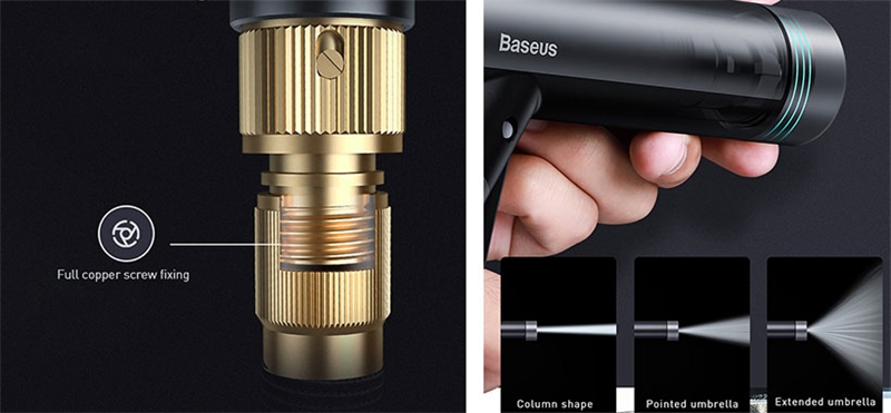 تفنگ آب پاش این محصول، فلزی است ولی به سادگی زنگ نمی زند. سری تفنگ آب پاش، حالت های مختلف پاشیدن آب ( مانند دوش حمام) دارد که می تواند به 3 حالت مختلف خطی آب را خارج کند یا به شکل چتری آب را پخش کند یا اینکه کاملا آب را با بیشترین دامنه ممکن به بیرون بریزد.