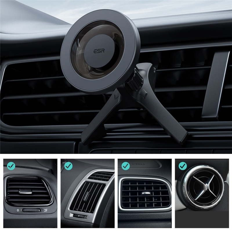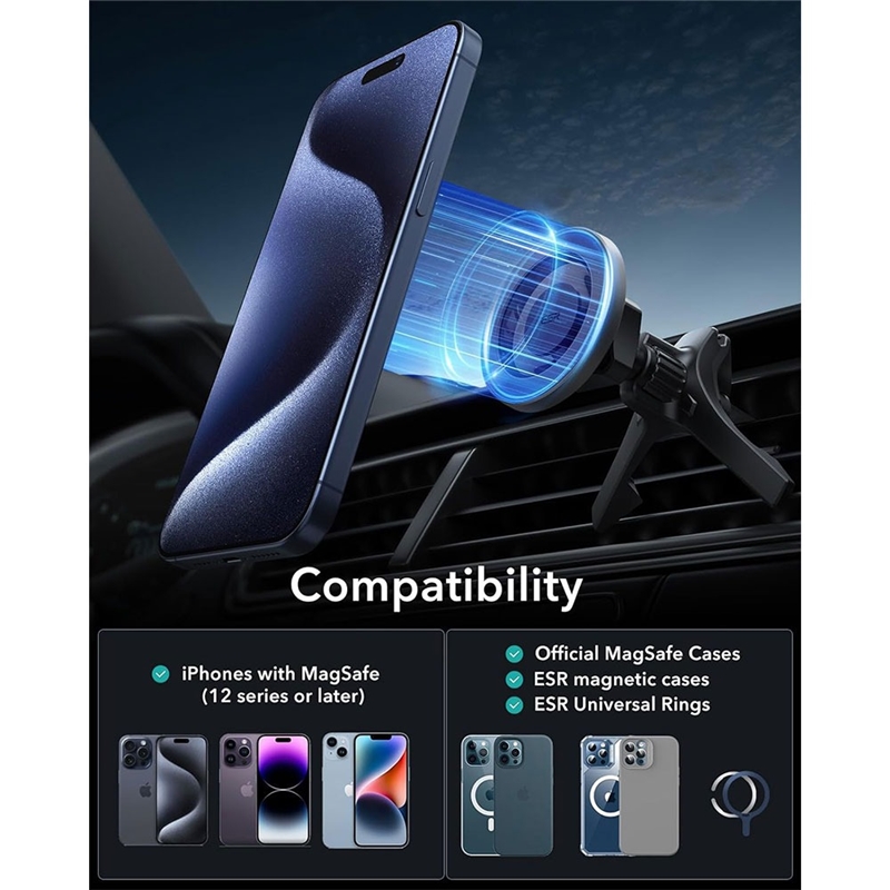 تطابق با انواع گوشیها: این نگهدارنده با تمام آیفونهای مجهز به تکنولوژی MagSafe (سری iPhone 12 به بعد)، کاورهای MagSafe، کاورهای HaloLock™ و کاورهای استاندارد با حلقه یونیورسال HaloLock™ سازگاری دارد.