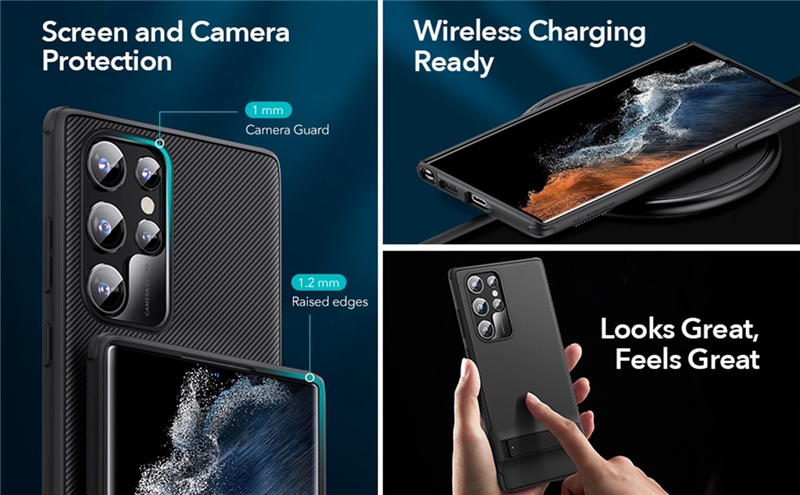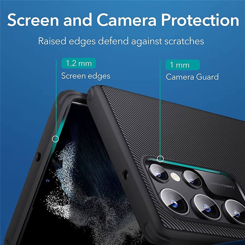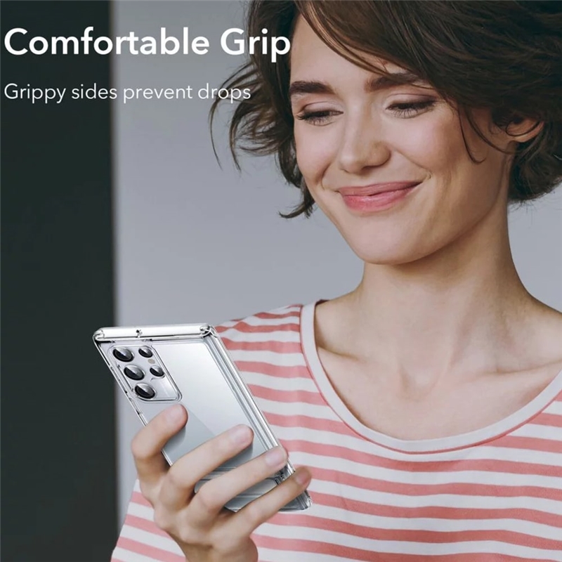 لبه های قاب ESR Air Shield Boost سامسونگ S22 Ultra کمی برجسته طراحی شده اند تا از لبه های صفحه نمایش گوشی محاقظت کنند. در قسمت پنل لنزهای دوربین نیز قاب کمی برجسته تر است تا از این ناحیه حساس نیز در برابر خط و خش و آسیب های مشابه هم محافظت شود.