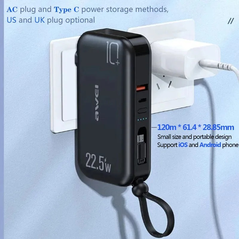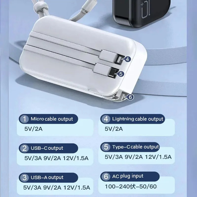 پاوربانک Bavin PC032Y در کل دارای 2 پورت USB و Type-C بوده که هر دو قابلیت فست شارژ دارند و 3 کابل متصل Type-C و لایتنینگ است که یکی از کابل متصل های Type-C به عنوان کابل شارژ و بند قابل استفاده بوده که این امر به حمل آسان تر پاوربانک کمک شایانی میکند.