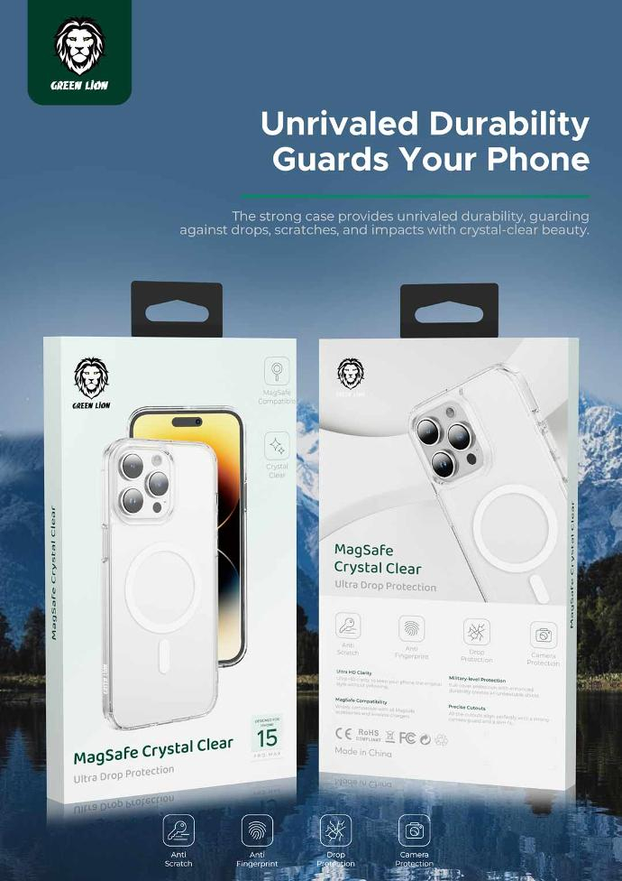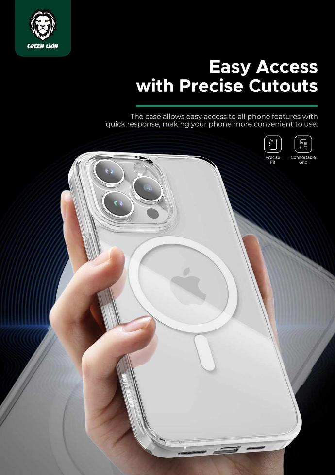 قاب شیشه ای Green Lion MagSafe Crystal Clear انعطاف پذیری فوق العاده در برابر سقوط و محافظت درجه نظامی را ارائه می دهد. کیفیت فوق العاده HD آن توسط سطح شفاف و ضد اثرانگشت آن تضمین شده است که با برش های عالی و محافظت از دوربین طراحی شده است. علاوه بر این، سازگار با خراش و MagSafe است. دفاع بی دردسر و ایمن ترکیب شده است.