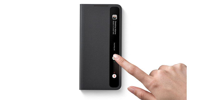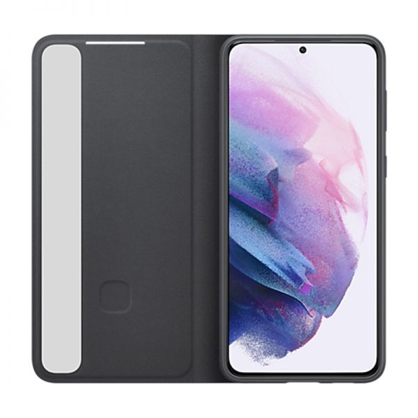 قسمت عمودی مشکی طراحی شده بروی کیف سامسونگ S21 Plus Clear View Cover علاوه بر زیبایی کاربردهای زیادی دارد که به شرح آنها میپردازیم : اعلان تاریخ و ساعت و قابلیت لمس ،کنترل موسیقی، نمایش تماس گیرنده و پاسخ دادن به تماس ها که دیگر نیاز نیست درب کیف هوشمند را باز کنید از روی همان نوار مشکی میتوانید به تماس ها پاسخ دهید.
