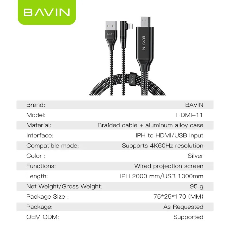 کابل HDMI به لایتنینگ باوین HDMI-11 از یک کانکتور لایتنینگ (آیفونی) و یک کانکتور HDMI تشکیل شده که شما می توانید تصاویر را از گوشی یا آیپد به مانیتور و یا تلوزیون های بزرگتر منتقل کنید. البته برای انتقال تصویر از موبایلتان باید دستگاه شما از این قابلیت پشتیبانی کند.