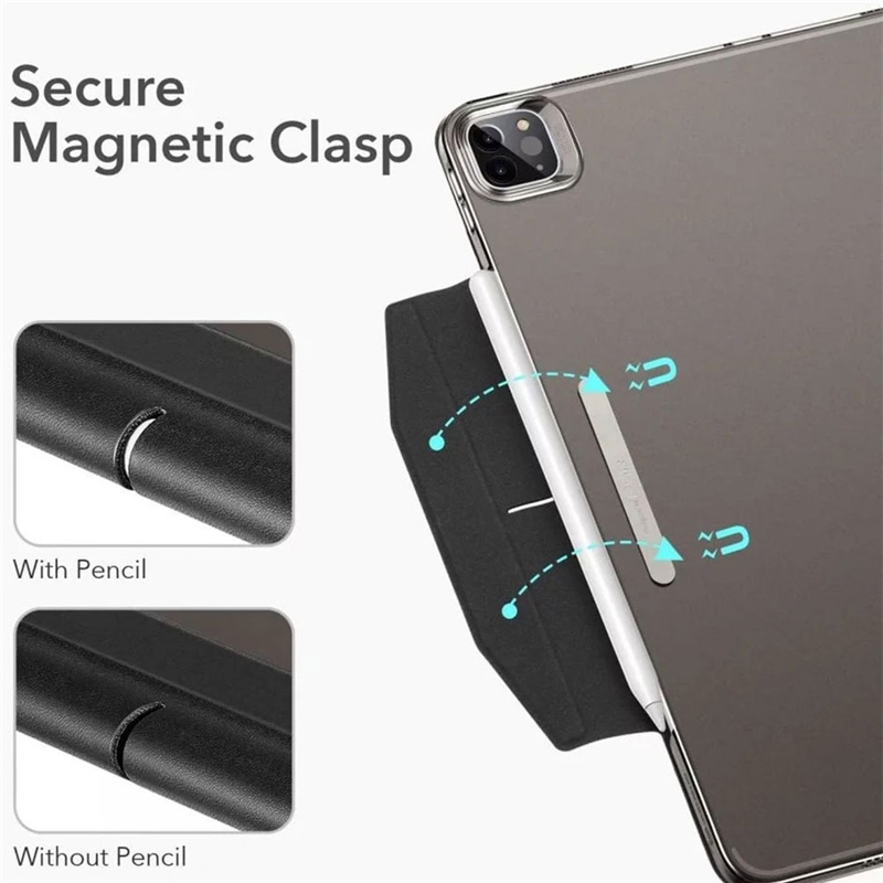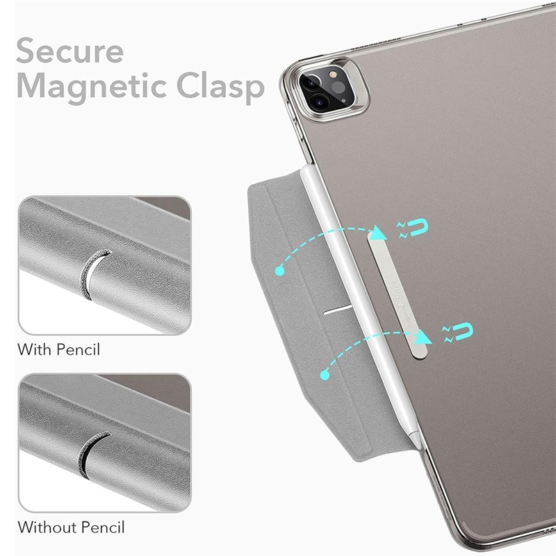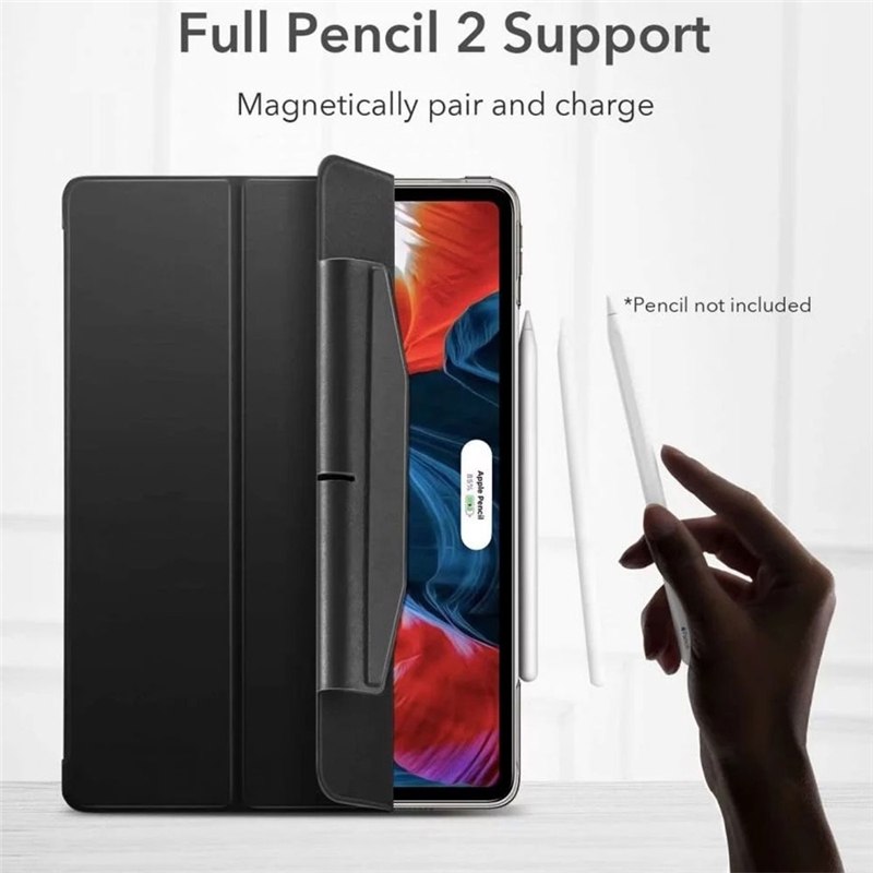 کاور با قفل مغناطیسی از صفحهنمایش محافظت میکند و با Pencil 2 همچنین از امکانات شارژ بیسیم پشتیبانی میکند. همچنین، قابلیت خواب خودکار و فعالسازی بهصورت فوری را فراهم میسازد.