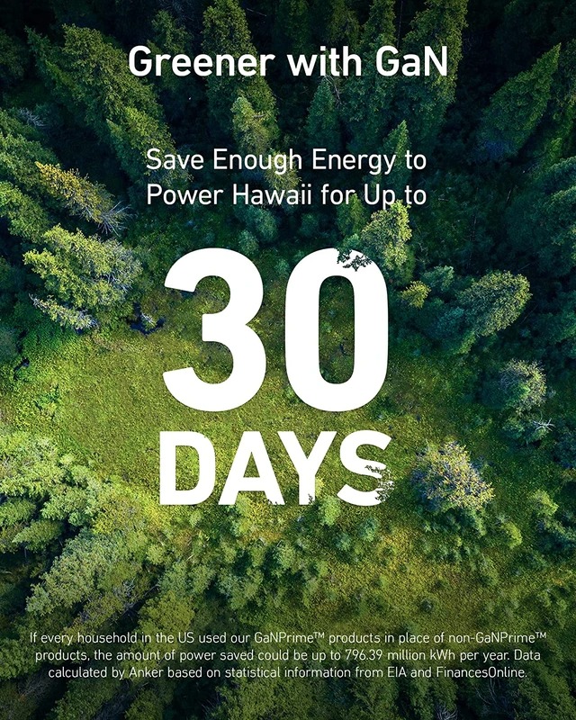 انکر در تبلیغات گسترده خود عنوان کرده است که اگر هر خانواده فقط در ایالت متحده از محصولات GaN Prime به جای محصولات غیر GaN Prime استفاده کنند، میزان صرفهجویی در مصرف انرژی به 796.39 میلیون کیلو وات در سال میرسد. جالب است بدانید که این مقدار انرژی برای تامین انرژی هاوایی به مدت یک ماه کافی است؛ اکنون تصور کنید که اگر در همه جای دنیا از این نوع محصولات استفاده شود، چه مقدار صرفهجویی در مصرف برق رخ خواهد داد!