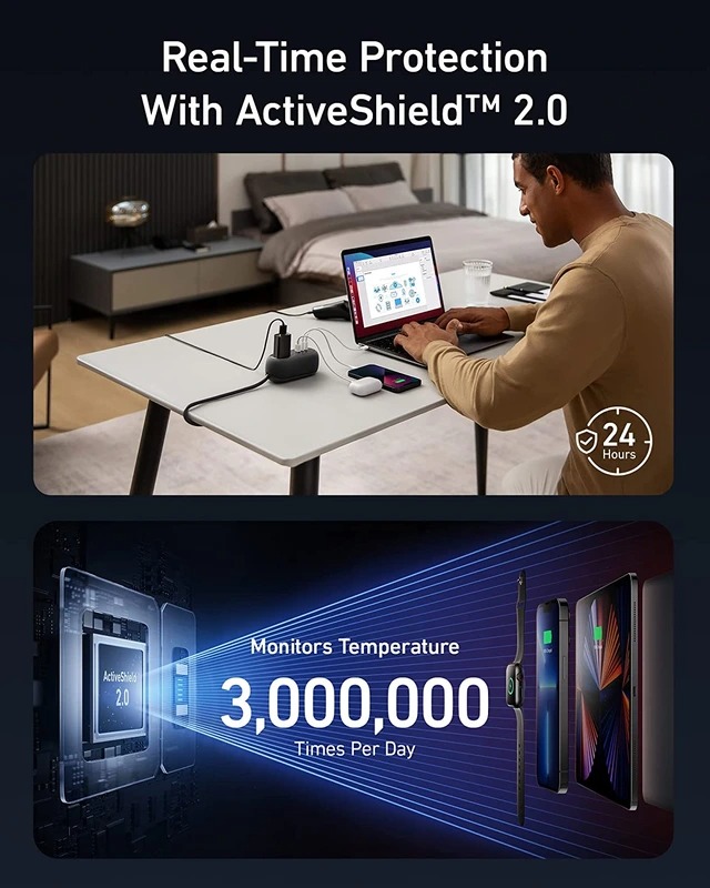 شارژر رو میزی انکر Anker 615 USB Power Strip A9125 از یک تکنولوژی حفاظتی دیگر به نام Active Shield 2.0 نیز بهره برده است. به کمک این فناوری، این چندراهی برق و شارژر انکر به یک سنسور تنظیم حرارت دینامیکی مجهز شده و به طور فعال و شبانهروزی به دما نظارت میکند. در حالت عادی هنگامی که لوازم الکترونیک به منظور شارژ شدن به آداپتورها متصل میشوند، دمای چندراهی یا کله شارژر بالا رفته و پس از مدتی داغ میشود؛ اما در این شارژر رومیزی به لطف این فناوری، دمای داخلی آن مدیریت شده و در نتیجه دما در سطحی متعادل کنترل میشود؛ این محصول از این طریق از دستگاههای دیگر محافظت کرده و به طول عمر خود نیز میافزاید. این شارژر رومیزی انکر، قابلیت کنترل دمای دستگاه تا 3 میلیون مرتبه در روز را داشته و از آنجایی که علاوه بر شارژ دستگاهها، به سلامت و ایمنی آنها اهمیت میدهد، یک وسیله تمام عیار و ارزشمند محسوب میشود.
