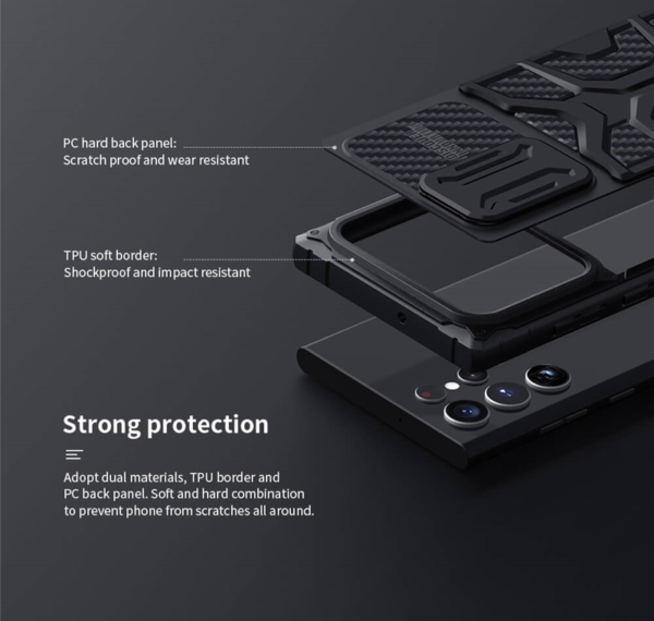 جدا از مقاومت بسیار بالا این قاب در بخش بالا دارای اسلاید کشوشی مخصوص محافظت از لنز های دوربین و حریم خصوصی می باشد که به راحتی میتوانید آن را باز و بسته کنید؛این قاب تمامی پشت و لبه های گوشی را پوشش می دهد،تمامی لبه های بالا پایین و اطراف این قاب Adventurer بسته بوده و بخش کلید ها گوشی هم به خوبی پوشش داده می شود، کلید های خود گارد بسار روان و راحت می باشد.
