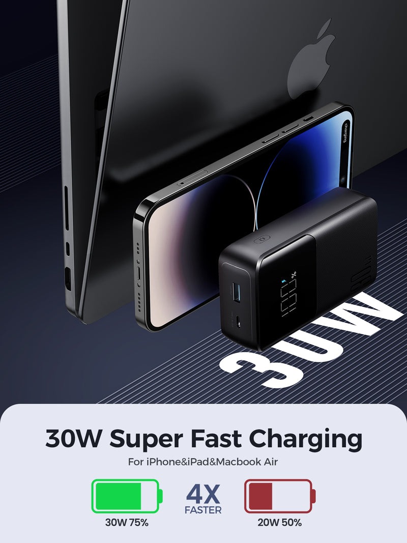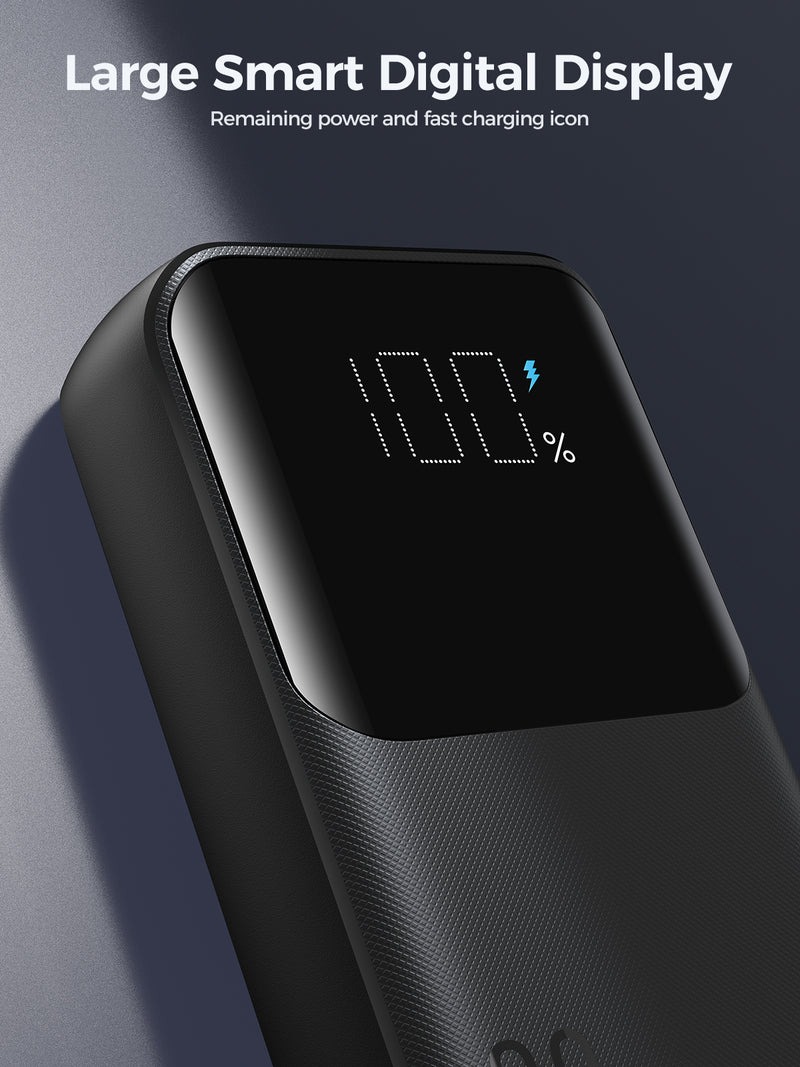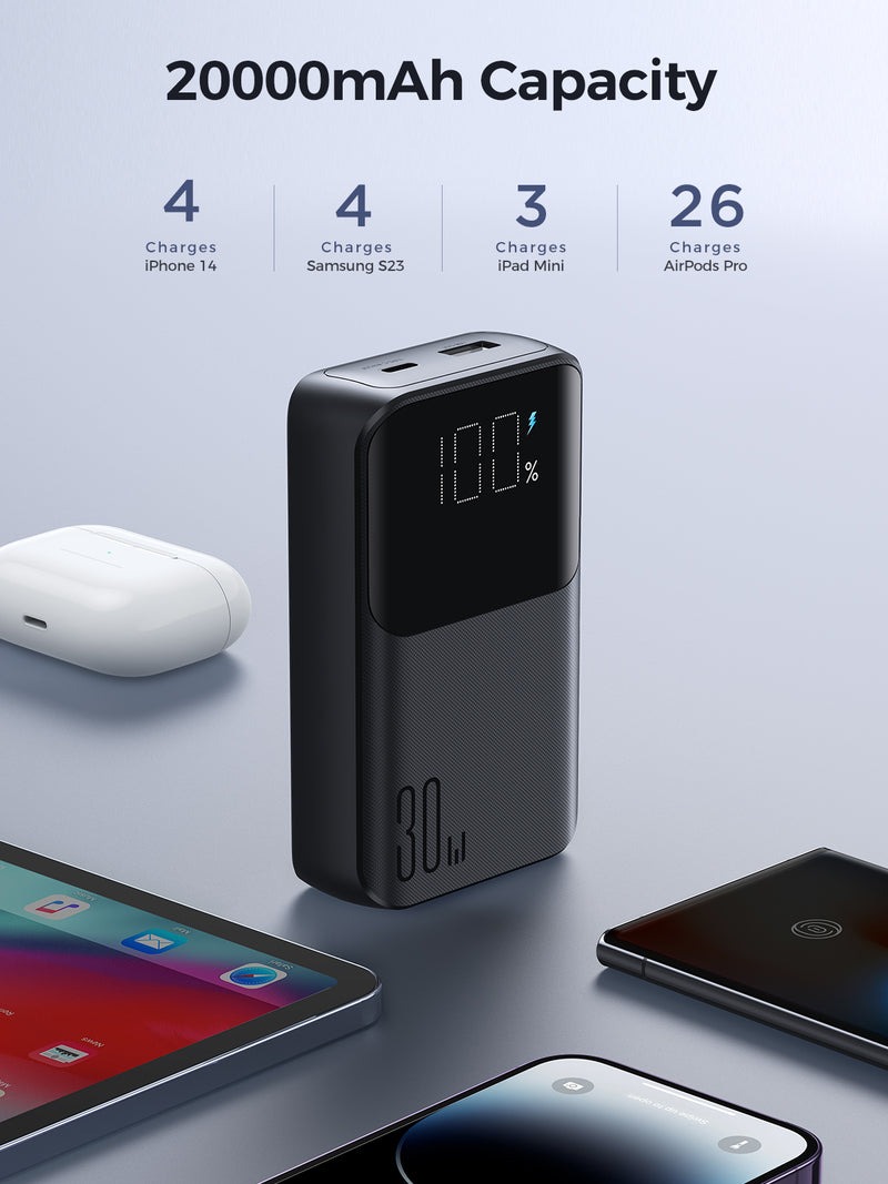 کابل همراه لایتنینگ و تایپ سی مناسب برای حمل در هواپیما 30 وات توان خروجی پورت تایپ سی و USB ظرفیت باتری 20000 صفحه نمایش دیجیتال برای نمایش درصد شارژ