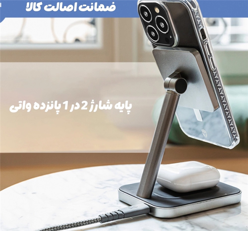 بسته‌بندی حاوی:‌ شارژر 15 وات 2 در 1 با فناوری MagSafe و یک کابل شارژ
