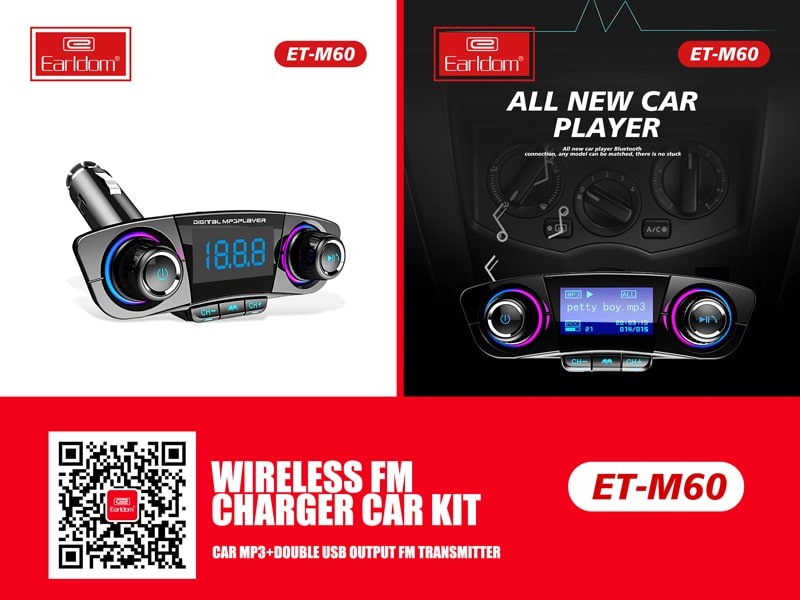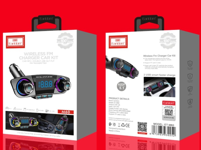 پخش کننده بلوتوث ارلدام ET-M60 با دارا بودن بلوتوث داخلی نسخه 5.1 به عنوان یک واسط میان گوشی شما و ضبط خودرو عمل میکند. این محصول به شارژر فندکی اتومبیل متصل میشود. بدنه اصلی این شارژر فندکی مشابه یک ضبط خودرو بوده و حالتی بسیار جذاب دارد. دو دکمه به منظور خاموش و روشن کردن، رفتن به آهنگ قبلی و بعدی، پخش و مکث پخش آهنگ و افزایش و کاهش ولوم بر روی این پخش کننده قرار گرفته است. دو درگاه USB در طرفین گیرنده بلوتوث Earldom ET-M60 و یک درگاه Micro SD نیز در زیر آن قرار گرفته است. شما همچنین میتوانید به راحتی به کمک این دستگاه تنها با یک بار فشردن دکمه روی این گیرنده بلوتوث به تماسهای تلفنی پاسخ دهید.