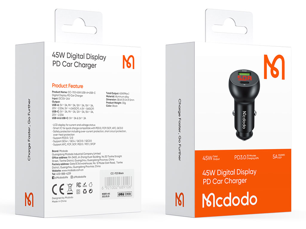 این شارژر وزن کمی دارد. ابعاد آن نیز محدود به 31.5×31.5×58.6 میلی‌متر است. درنتیجه هیچ‌گونه فضایی را اشغال نمی‌کند و به‌خوبی به قسمت فندکی بسیاری از وسایل نقلیه، از خودروهای شخصی گرفته تا کامیون‌ها، چفت می‌شود.بدنه‌ی CC-7030 از آلیاژ آلومینیوم ساخته شده و به همین دلیل دربرابر آسیب‌های روزانه (ضربه، افتادن، فشار و...) بسیار مقاوم است. از طرفی آلیاژ آلومینیوم از داغ شدن شارژر جلوگیری می‌کند تا هم طول‌عمر آن تضمین شود و هم کارایی بهینه و ایمن آن برای شارژدهی به دستگاه‌ها.برروی این بدنه 1 درگاه Type-C و 1 درگاه USB-A دیده می‌شود و بین این دو پورت، نشانگری LED وجود دارد. این چراغ قرمزرنگ ولتاژ ورودی به لوازم درحال شارژ را به‌صورت عددی و لحظه‌به‌لحظه برای اطلاع شما به نمایش درمی‌آورد.فارغ از این موارد آنچه در درجه‌ی بالای اهمیت قرار دارد، توانایی شارژر فندکی CC-7030 مک دودو در شارژدهی است. همان‌طور که گفته شد، این شارژر 1 پورت تایپ‌سی و 1 پورت یو.اس.بی دارد که به شما امکان می‌دهند تا 2 دستگاه را به‌طور هم‌زمان و با توان، ولتاژ و شدت‌جریان 15 وات، 5 ولت و 3 آمپر در کمترین زمان ممکن شارژ کنید.با این حال، اگر بخواهید فقط یک دستگاه را به‌وسیله‌ی یکی از این دو درگاه شارژ کنید، CC-7030 می‌تواند تا حداکثر 45 وات توان برای این کار اختصاص دهد. این شارژر به فناوری‌های شارژ سریع AFC, FCP, SCP, QC 3.0 و PD 3.0 برای شارژ سریع گوشی‌های اندرویدی، لپ‌تاپ‌ها، تبلت‌ها و... مجهز است، پس می‌تواند همه‌ی توقعات شما را در این رابطه برآورده کند. به‌عنوان مثال درگاه Type-C این شارژر به لطف تجهیز به نسخه‌ی سوم تکنولوژی Power Delivery، قادر است تلفن همراه شما را درعرض 15 دقیقه تا 30 درصد شارژ کند.همچنین اگر صاحب گوشی هوآوی باشید، می‌توانید آن را به درگاه USB-A این شارژر متصل کنید. در این صورت شاهد شارژ شدن آن در بهینه‌ترین حالت ممکن و با 22.5 وات توان خواهید بود.آنچه به کمک سرعت بالا می‌آید و بهبود عملکرد شارژر فندکی CC-7030 مک دودو را موجب می‌شود، جاگذاری تراشه‌ی هوشمندی‌ست که بر حفظ ایمنی فرایند شارژدهی نظارت می‌کند. به این ترتیب باتری لوازم شما از صدماتی همچون شارژ، ولتاژ یا شدت‌جریان بیش‌ازحد، داغ شدن، اتصال کوتاه و... مصون می‌مانند.