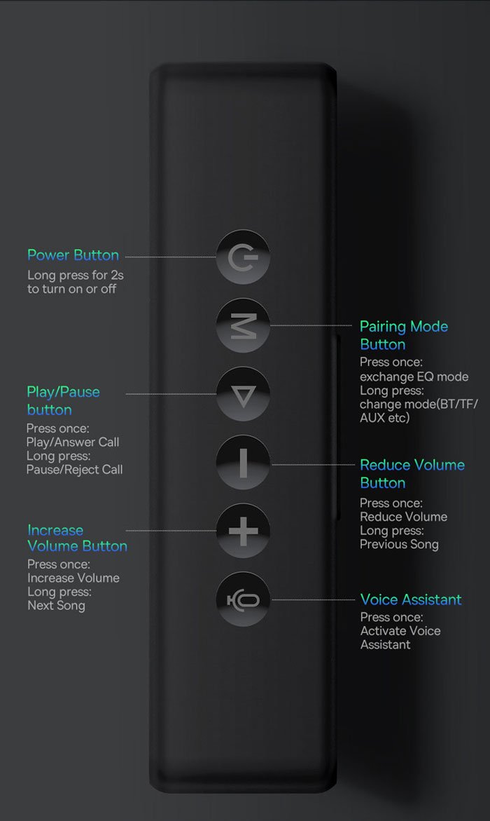- کاربری کلید بعدی که با حرف M علامت‌گذاری شده برای تعیین حالت جفت شدن است. یعنی برای داشتن صدای بالانس‌تری با یک بار فشار می‎توانید آن را روی حالت EQ تنظیم کنید. با فشار طولانی هم قابل تنظیم روی حالت‎های BT, TF, AUX و ... است.