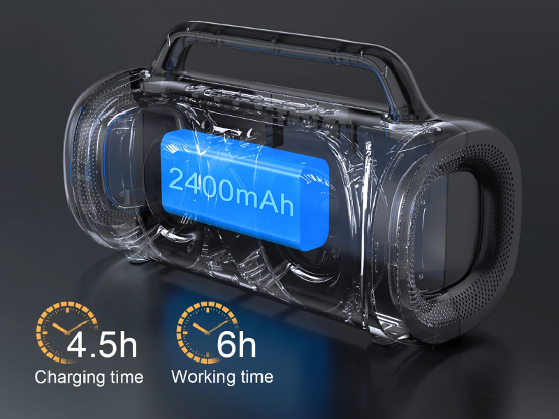 باتری داخل اسپیکر Joyroom JR-MW02 ظرفیتی معادل 2400 میلی آمپر ساعت دارد و با هر بار شارژکه 4 ساعت زمان لازم دارد؛ میتواند حدود 6 ساعت به پخش موسیقی بپردازد و 24 ساعت در حالت آماده باش قرار بگیرد. که این میزان در محیط آزمایشگاهی بدست آمده است. البته عددی که گفته شد، به طور میانگین است، در حقیقت این عدد کاملا وابسته به میزان حجم صدایی است که شما با آن به موسیقی گوش خواهید داد.