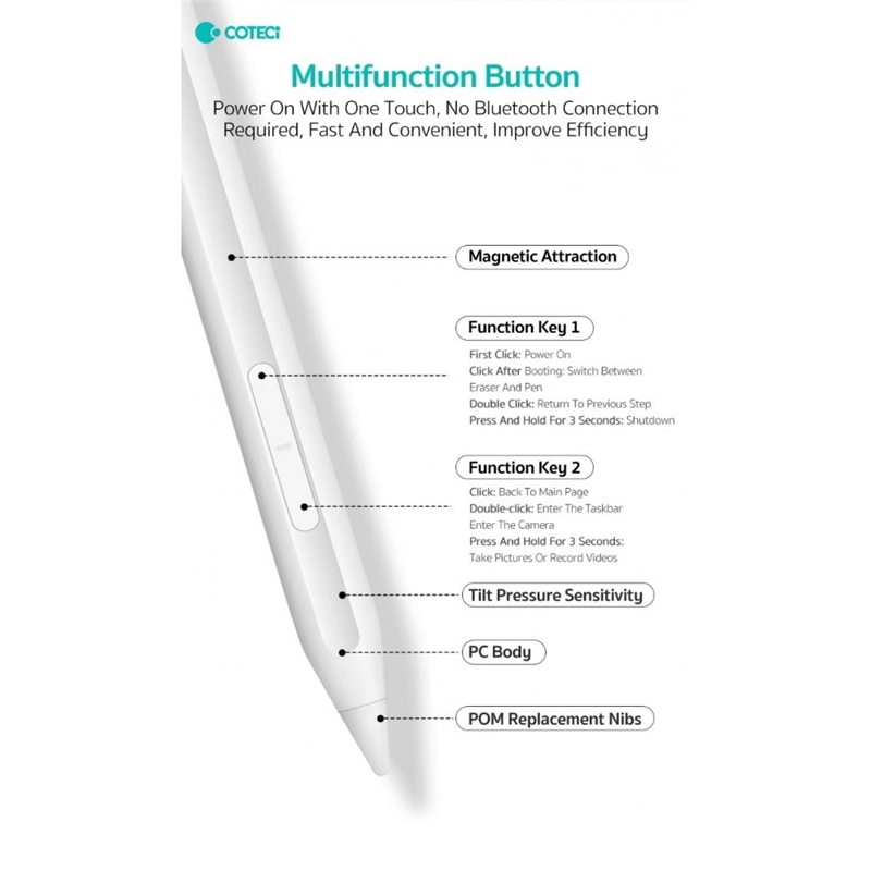 بر روی قلم قلم لمسی Coteetci 62013 دو دکمه با انجام قابلیت های خاص طراحی شده است؛ شما می توانید این قابلیت ها را در گالری عکس این محصول مشاهده کنید.