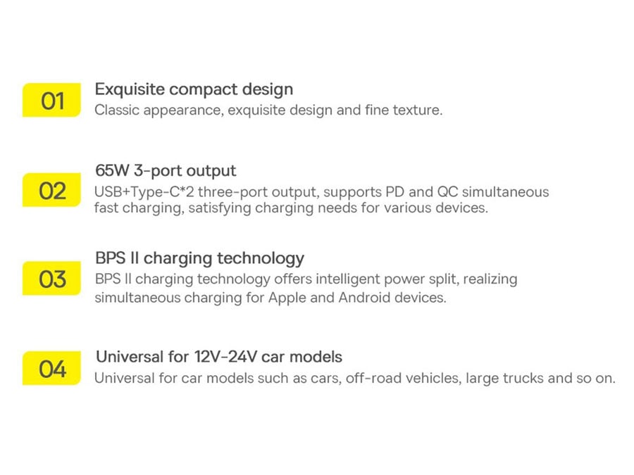 شارژر فندکی خودرو بهترین ابزار شارژر موبایل برای افرادی است که بیشتر اوقات خود را در خودروهایشان یا بیرون از منزل به سر میبرند. نمونهای از آنها هم با نام Baseus Golden Contactor Pro CGJP010003 توسط کمپانی بیسوس تولید شده و بسیار باکیفیت است