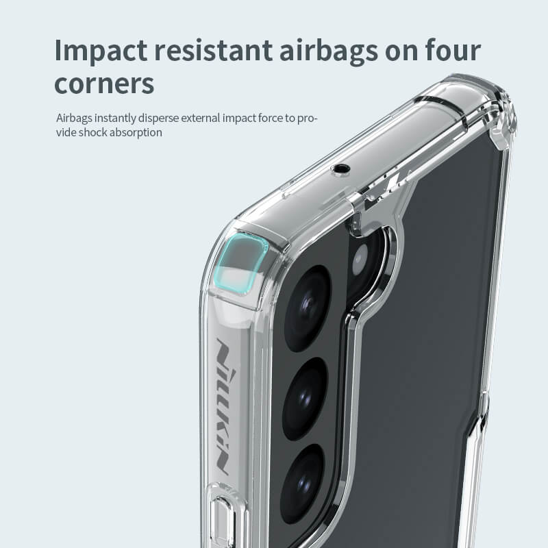 گوشه‌های قاب S22 Samsung نیلکین مدل Nature TPU Pro دارای طراحی‌های ایربگ مانند هستند. این فرم از طراحی باعث می‌شود تا ضربه بهتر دفع شود. این به اصطلاح کیسه‌های هوا! با فاصله‌ای که در قاب ، از بدنه موبایل ایجاد کرده‌اند، مانع از برخورد مستقیم ضربه به تلفن همراه از قسمت گوشه‌ها خواهند شد. کناره‌های قاب نیز دارای فرمی است که از لغزش قاب هنگام در دست گرفتن آن جلوگیری می‌کند.