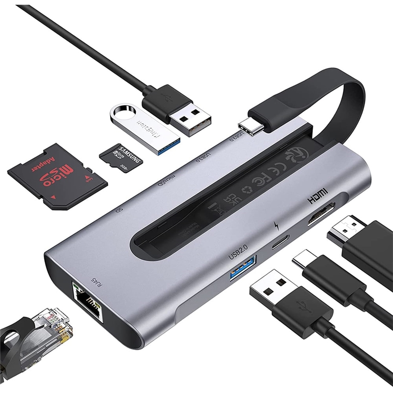 این هاب دارای 8 پورت خروجی می باشد. این پورت ها شامل یک پورت کارت حافظه، یک پورت SD، دو پورت USB 3.0، یک پورت HDMI، یک پورت C، یک پورت USB 2.0 و یک پورت RJ45 برای اتصال کابل شبکه می شوند که از تمامی پورت های می توان به صورت همزمان استفاده نمود.