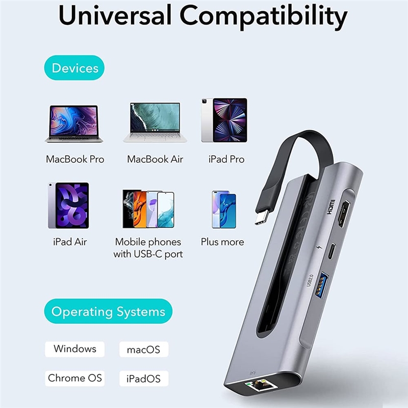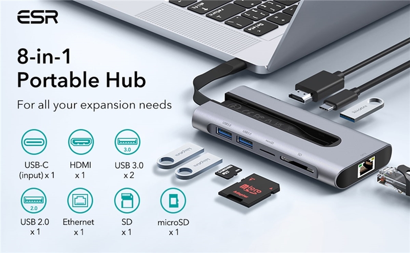 هاب USB-C 8-in-1 مک بوک ESR با انواع لپ تاپ ها، تبلت ها و گوشی های داری پورت USB-C سازگار است که شامل مک بوک پرو، مک بوک ایر، مایکروسافت سورفیس، آیپد پرو، آیپد ایر و تبلت ها و گوشی های اندروید می شود.