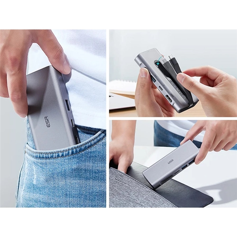 یک از فاکتورهایی که هنگام تهیه لوازم جانبی باید به آن توجه شود، کم حجم بودن و حمل آسان آن می باشد. “هاب USB-C 8-in-1 مک بوک ESR” به صورت یکپارچه طراحی شده است. این بدان معناست که کابل خروجی آن، مانند تصاویر کاملا درون بدنه اصلی قرار می گیرد تا در نهایت این گجت برای خمل آسان جمع و جور باشد.