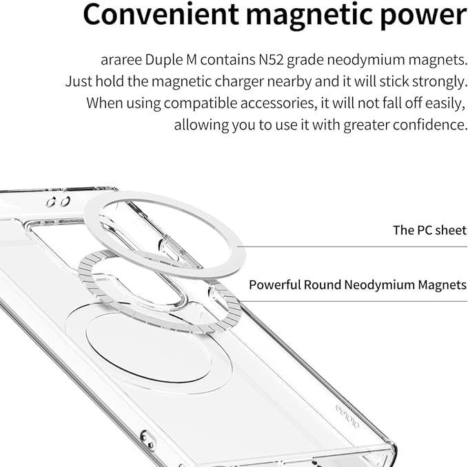 قاب مگنتی سامسونگ S24 Plus Araree Duple M از PC ساخته شده است که قسمت پشتی آن شفاف است. برای محافظت از صفحه نمایش و دوربین لبه های قاب و دور اطراف دوربین نیز دارای پوششی از جنس PC مجهز شده اند.