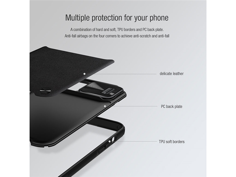 کیف چرمی CamShield که نوعی زیبایی بصری ساده و مجلل را ارائه می دهد، قطعا یک طراحی کلاسیک است. این پوسته ترکیبی از سخت و نرم را با اتصال لبه‌های TPU و صفحه پشتی رایانه شخصی برای جلوگیری از افتادن و خراشیدگی به کار می‌گیرد، و لایه‌ای از چرم بافت‌دار که صفحه پشتی رایانه شخصی را می‌پوشاند دارای یک لمس ظریف و ابریشمی، ضد اثر انگشت و جلوگیری از آلودگی روغن است. پوشش کشویی لنز ثبت شده نه تنها از خراشیدن لنز جلوگیری می کند، بلکه از حریم خصوصی تلفن شما در برابر افشای آن محافظت می کند. همچنین نوارهای ضد لغزش با شکستگی براق براق لیزری در دو طرف اضافه شده است تا عملکرد ضد سقوط را ارتقا دهد.متریال ترکیبی از سخت و نرم حاشیه‌های نرم TPU و قاب پشتی سخت و با ترکیب چرم ظریف، تلفن همراه شمارا در برابر ضربدیدگی و خط و خش محافظت می‌کند.