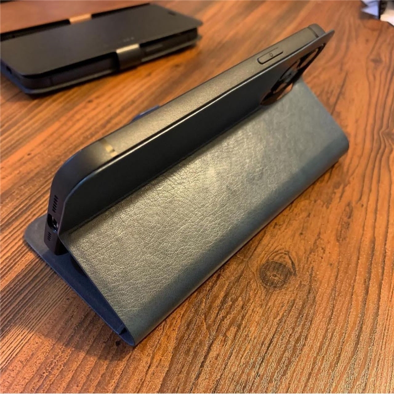 یکی از ویژگی های کاربردی این کیف چرمی امکان نگهداری گوشی به حالت استند روی میز و یا روی سطوح صاف است. هنگامی که از درب گوشی تا می کنید می توانید آن را در زاویه دید مناسب روی میز قرار دهید. یکی از نکات جالبی که در طراحی این کیف به چشم می خورد، شیاری جهت نگهداری سیمکارت و سوزن سیمکارت گوشی است که داخل درب پشت کیف به صورت مخفی به کار رفته است.