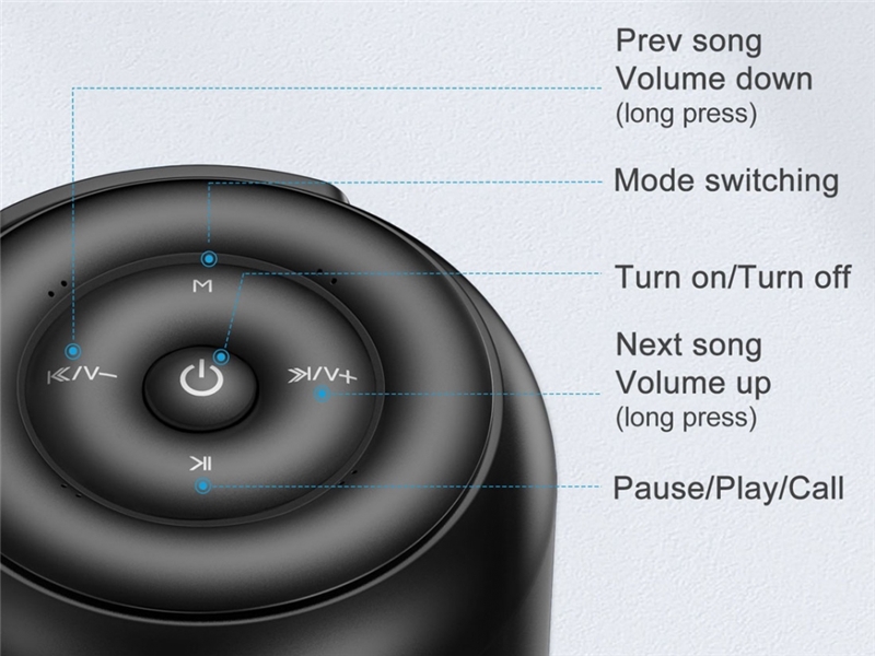 کلید کنترل این اسپیکر در قسمت بالایی به صورت یک پنل است. این دکمهها به ترتیب برای روشن و خاموش کردن، پخش و توقف آهنگ، کم و زیاد کردن صدا و تغییر حالت از بلوتوث به رم قابل استفاده است. این دستگاه از فرمت های موزیک MP3 و WAV پشتیبانی میکند.