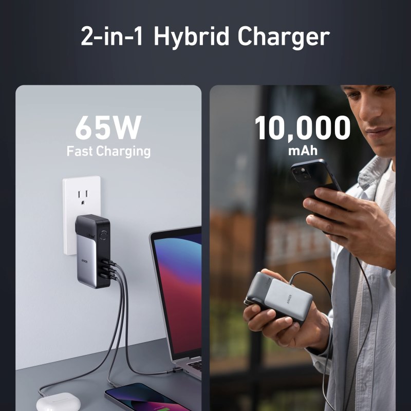 شارژر ۲ در ۱: با یک شارژر دیواری هیبریدی ۶۵ واتی و یک شارژر قابل حمل ۱۰۰۰۰ میلی آمپر ساعتی از بهترین های هر دو دنیا لذت ببرید.