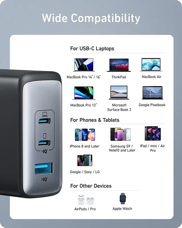دو پورت: USB-C 1 + USB-C 2 (60 وات حداکثر + ۴۰ وات حداکثر) / USB-C 1 + USB-A (80 وات حداکثر + حداکثر ۱۸ وات) / USB-C 2 + USB-A (60 وات حداکثر + ۲۲.۵ وات حداکثر)