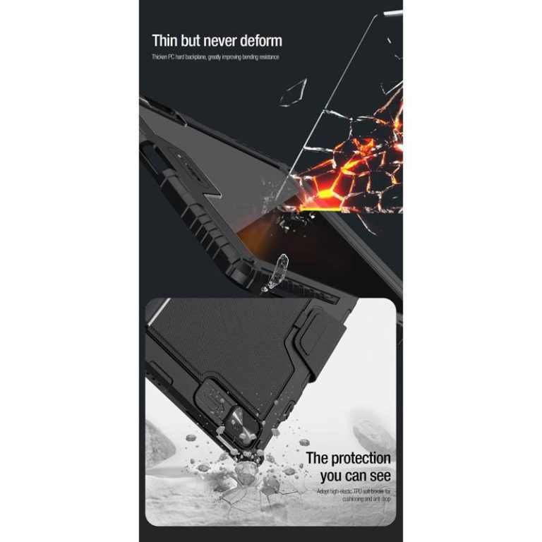 کیف کلاسوری نیلکین مدل Bumper Combo Backlit Keyboard جدیدترین نسخه Combo Keyboard اواخر سال 2023 می باشد که در مدل Backlit علاوه بر ویژگی های نسخه قبلی ویژگی نور پس زمینه در کیبورد با 7 رنگ متفاوت به آن اضافه شده که دیگر در فضای کم نور و یا شب به راحتی میتوانید از کیبورد استفاده کنید و دیگر دغدغه نور هنگام تایپ کردن را نداشته باشید.جنس این کاور ازTPUوPCساخته شده که دارای مقاومت بالایی می باشد.این کیف کلاسوری دارای محافظ دوربین بوده که به صورت کشویی عمل میکند.یکی از قابلیت های مفید در قاب تبلت ها داشتن استند است؛چون این دستگاه ها ابعاد بزرگی دارند و نگهداری از آنها روی استند بسیار راحت تر و کم خطر تر است.از همین رو کیف کلاسوری دارای یک استند تاشو است که استحکام کافی برای نگهداشتن و استفاده از تبلت را خواهد داشت.شما می توانید حالت های مختلفی برای قرار گرفتن تبلت انتخاب کنید.این استند قابلیت تنظیم زاویه بین 110تا180درجه را دارد.این محصول نیلکین دارای یک کیبورد قابل جدا شدن می باش .شما در صورت نیاز می توانید از این کیبورد استفاده کرده و یا آن را جدا کنید.کلیدهای این کیبورد به گونهای(قطرهای)طراحی شده که قالب انگشتان شما باشد.این کلیدها بسیار بی صدا بوده و وزن پایینی دارد؛بعلاوه کار با آن شما را خسته نمیکند.کلیدهای کیبورد کیف کلاسوری بسیار حساس بوده و با کمترین فشار عمل خواهد کرد.بر روی این کیبورد یک پد لمسی وجود دارد که می توانید از آن به جای موس استفاده کنید.شما می توانید از طریق بلوتوث این کیبورد را به دستگاه خود متصل کنید.نرخ نمونه برداری لمسی پد لمسی آن120هرتز بوده که بسیار حساس بوده و از چند لمس همزمان پشتیبانی می کند.این کیبورد دارای یک باتری5000میلی آمپر ساعتی بوده که برای پر شدن آن نیاز به حدود 3 ساعت شارژ بوده و با پر بودن شارژ تا100 ساعت می توانید از آن استفاده کنید؛البته این عدد برای روزی2ساعت کار با کیبورد است که متناسب با استفاده شما متغییر خواهد شد.قابل ذکر است نسخه بلوتوث این کیبورد3.0می باشد و محدوده عملکرد آن حدود10متر است.در قسمت جلویی این قاب، جای برای قرار گرفتن قلم هوشمند اپل تعبیه شده که می توانید قلم خود را در این قسمت ها قرار دهید. با قرار گرفتن قلم در قسمت جلویی تعبیه شده در تبلت، می توانید قلم خود را به صورت وایرلس شارژ کنید.