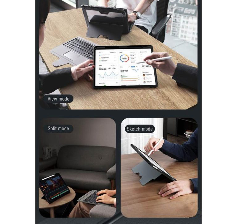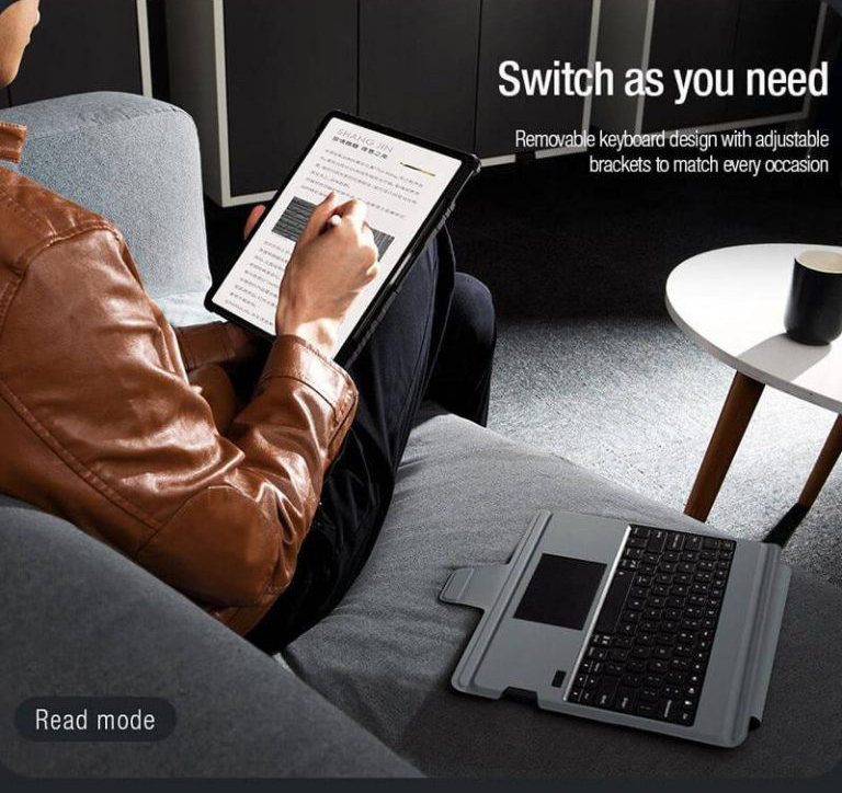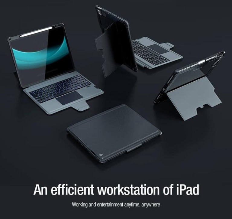 کیف کلاسوری نیلکین مدل Bumper Combo Backlit Keyboard جدیدترین نسخه Combo Keyboard اواخر سال 2023 می باشد که در مدل Backlit علاوه بر ویژگی های نسخه قبلی ویژگی نور پس زمینه در کیبورد با 7 رنگ متفاوت به آن اضافه شده که دیگر در فضای کم نور و یا شب به راحتی میتوانید از کیبورد استفاده کنید و دیگر دغدغه نور هنگام تایپ کردن را نداشته باشید.جنس این کاور ازTPUوPCساخته شده که دارای مقاومت بالایی می باشد.این کیف کلاسوری دارای محافظ دوربین بوده که به صورت کشویی عمل میکند.یکی از قابلیت های مفید در قاب تبلت ها داشتن استند است؛چون این دستگاه ها ابعاد بزرگی دارند و نگهداری از آنها روی استند بسیار راحت تر و کم خطر تر است.از همین رو کیف کلاسوری دارای یک استند تاشو است که استحکام کافی برای نگهداشتن و استفاده از تبلت را خواهد داشت.شما می توانید حالت های مختلفی برای قرار گرفتن تبلت انتخاب کنید.این استند قابلیت تنظیم زاویه بین 110تا180درجه را دارد.این محصول نیلکین دارای یک کیبورد قابل جدا شدن می باش .شما در صورت نیاز می توانید از این کیبورد استفاده کرده و یا آن را جدا کنید.کلیدهای این کیبورد به گونهای(قطرهای)طراحی شده که قالب انگشتان شما باشد.این کلیدها بسیار بی صدا بوده و وزن پایینی دارد؛بعلاوه کار با آن شما را خسته نمیکند.کلیدهای کیبورد کیف کلاسوری بسیار حساس بوده و با کمترین فشار عمل خواهد کرد.بر روی این کیبورد یک پد لمسی وجود دارد که می توانید از آن به جای موس استفاده کنید.شما می توانید از طریق بلوتوث این کیبورد را به دستگاه خود متصل کنید.نرخ نمونه برداری لمسی پد لمسی آن120هرتز بوده که بسیار حساس بوده و از چند لمس همزمان پشتیبانی می کند.این کیبورد دارای یک باتری5000میلی آمپر ساعتی بوده که برای پر شدن آن نیاز به حدود 3 ساعت شارژ بوده و با پر بودن شارژ تا100 ساعت می توانید از آن استفاده کنید؛البته این عدد برای روزی2ساعت کار با کیبورد است که متناسب با استفاده شما متغییر خواهد شد.قابل ذکر است نسخه بلوتوث این کیبورد3.0می باشد و محدوده عملکرد آن حدود10متر است.در قسمت جلویی این قاب، جای برای قرار گرفتن قلم هوشمند اپل تعبیه شده که می توانید قلم خود را در این قسمت ها قرار دهید. با قرار گرفتن قلم در قسمت جلویی تعبیه شده در تبلت، می توانید قلم خود را به صورت وایرلس شارژ کنید.