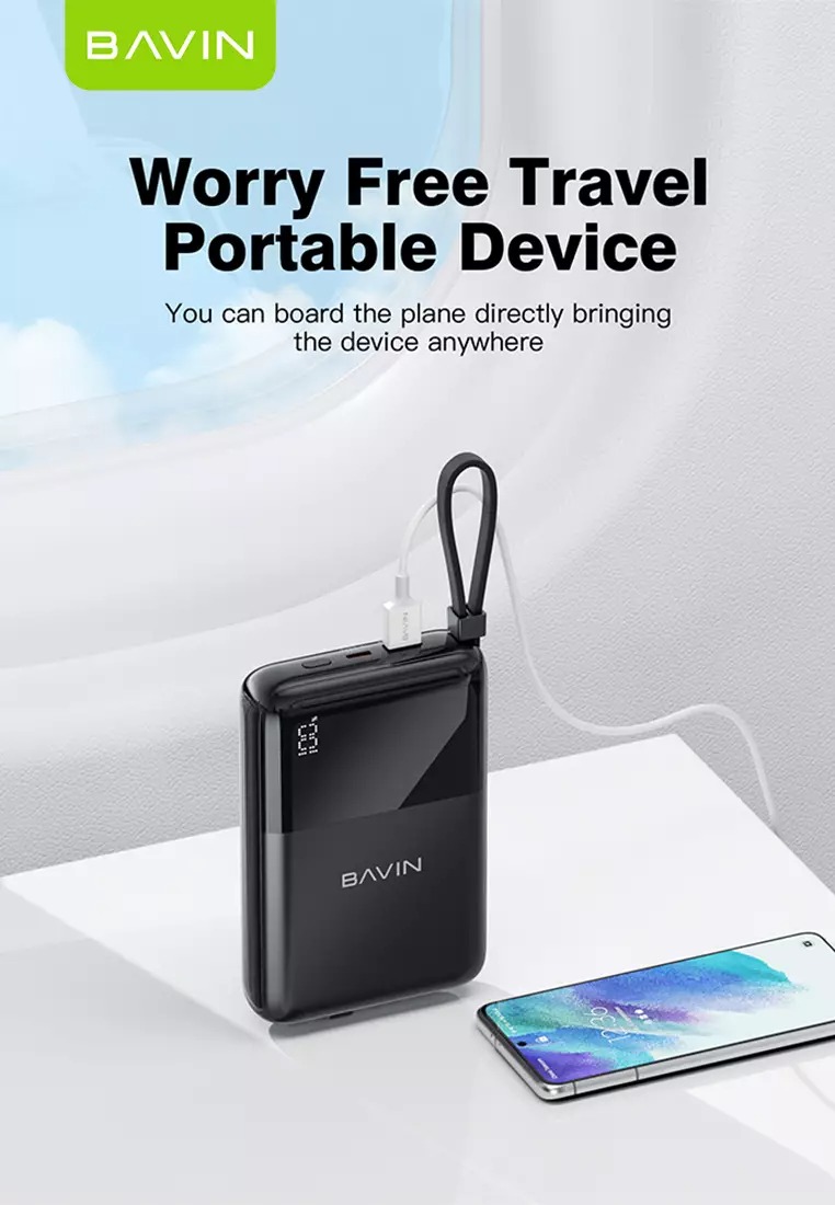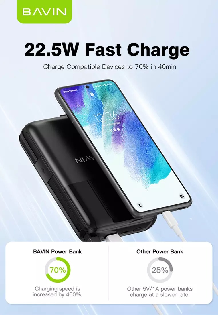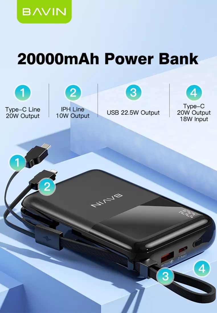 پاوربانک 20000 باوین Bavin PC1023S Fast Charge توان 22.5 وات همراه با کابل متصل